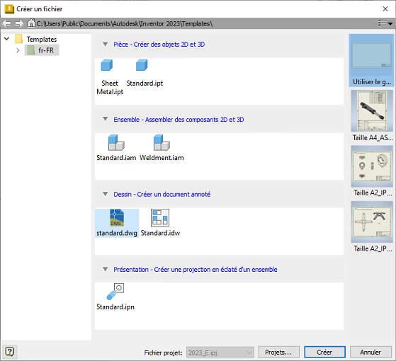Vous pouvez utiliser un format de feuille dans le gabarit lors de la création d’un fichier dessin.