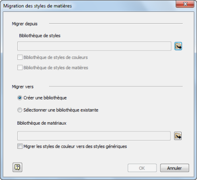 Dans la boîte de dialogue Migration des styles de matières, spécifiez l’emplacement Migrer depuis où se trouve le fichier InventorMaterialLibrary.adsklib ou un fichier de bibliothèque personnalisé. Le chemin par défaut est C:\Users\Public\Documents\Autodesk\Inventor [version]\Design Data\Materials.