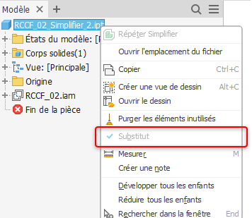 Chaque fois qu’une pièce ou un ensemble est créé en tant que substitut, à l’aide de l’option Dériver ou Simplifier, le composant obtenu se voit attribuer l’état de substitution en lecture seule. L’état du substitut s’affiche dans le menu contextuel du composant.