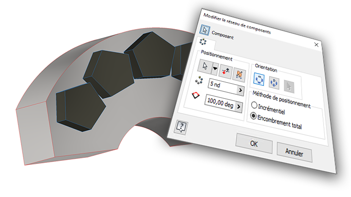Vous pouvez désormais sélectionner une face de révolution, cylindrique ou conique, pour définir la direction d’un réseau de composants. La commande Composant de réseau utilise l’axe de la face pour définir la direction du réseau. Utilisez des commandes standard pour inverser la direction.