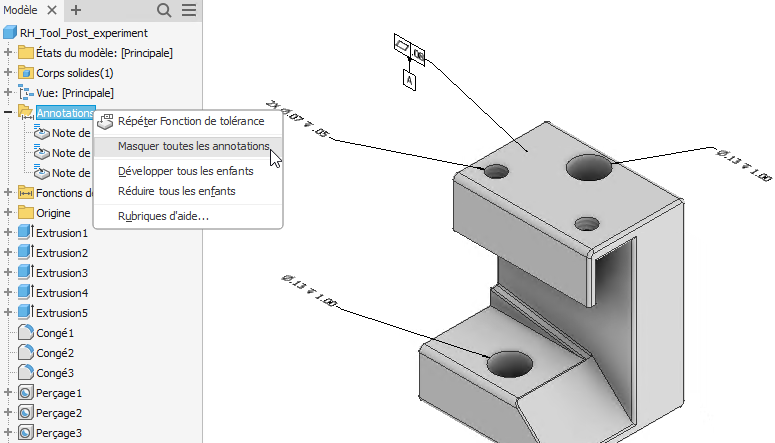 Toutes les annotations 3D sont rangées dans un dossier du navigateur Modèle. Vous pouvez toutes les masquer en même temps en sélectionnant Masquer toutes les annotations dans le menu contextuel du dossier.