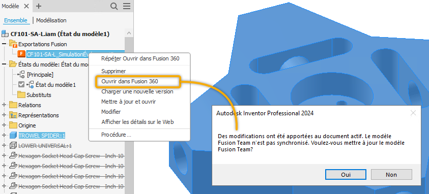 Si une modification a été apportée à l’état du modèle Inventor ou dans la vue de conception utilisée pour une exportation Fusion 360, et que vous cliquez sur Ouvrir dans Fusion 360 via le menu contextuel d’exportation, on vous signale que les modèles Inventor et Fusion 360 ne sont pas synchronisés et vous avez la possibilité de mettre à jour le modèle Fusion 360 avant de l’ouvrir.