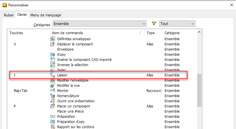 La touche « J » est désormais utilisée comme touche de raccourci pour lancer la commande Placer une liaison dans les ensembles, les constructions soudées et la simulation dynamique.