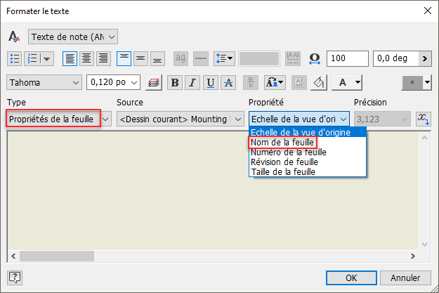 Le nom de la feuille est ajouté en tant que propriété de feuille et peut être utilisé dans le texte.