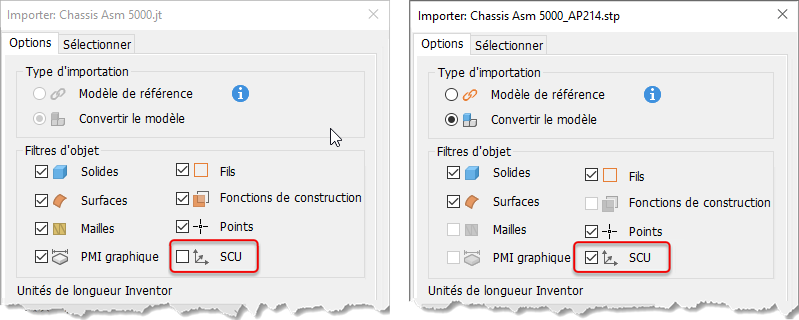 Les formats JT et STEP prennent en charge l’option permettant d’inclure le SCU lors de l’importation.