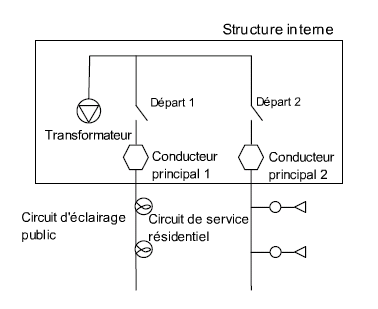 Vous pouvez créer un dessin distinct destiné à contenir une vue interne d'une structure. Par exemple, au niveau d'un poste électrique, un conducteur d'un segment peut être relié à un appareil interne (transformateur, départ ou fusible). Les dispositifs internes sont reliés entre eux par un conducteur.