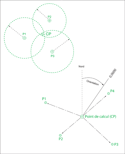 Utilisez la fonction Point lancé pour calculer les résumés de station, les stations libres ou le centre de trois cercles. Les corrections et les écarts résiduels ainsi que l'azimut (orientation) s'affichent.