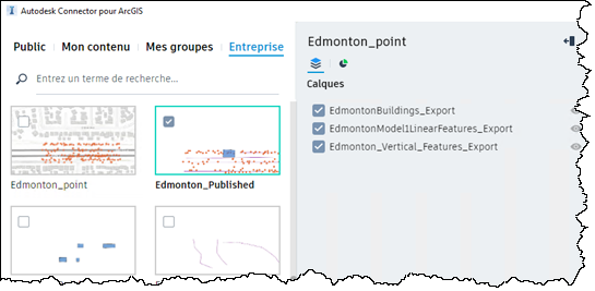 Autodesk Connector for ArcGIS ® utilise vos informations de connexion ESRI ArcGIS pour relier le jeu d’outils AutoCAD Map 3D à vos données ArcGIS. Une fois que vous êtes connecté, utilisez Autodesk Connector for ArcGIS pour parcourir les jeux de données disponibles et ajouter des calques de données ArcGIS à votre dessin Map 3D.