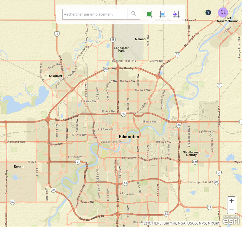 Spécifiez un nom d'emplacement, une adresse ou un point d'intérêt dans la barre de recherche. Vous pouvez également saisir des coordonnées longitudinales et latitudinales, ou importer un fichier SHP définissant votre zone d'intérêt. Utilisez la souris pour effectuer un panoramique ou un zoom, ou utilisez les outils de zoom avant/arrière (boutons +/-) pour affiner votre recherche. Définissez votre zone d'intérêt à l'aide des outils de sélection.