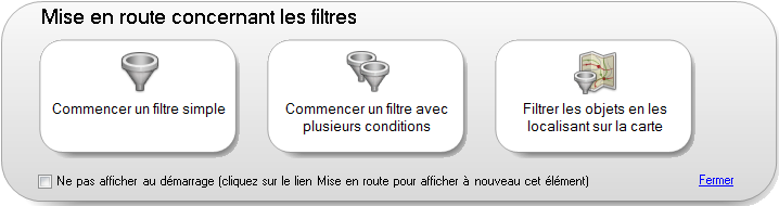 Pour empêcher l'affichage de ces boutons chaque fois que vous créez une expression, activez la case à cocher Ne pas afficher au démarrage. Vous pouvez les réafficher plus tard en cliquant sur Mise en route.