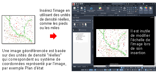 L'exemple ci-dessous montre la relation entre l'unité de densité et une image ayant des informations de référence géographique. Etant donné qu'il n'existe pas d'échelle papier à prendre en compte, vous pouvez insérer l'image en utilisant l'unité que représente l'image, tels que les pieds ou les miles, et vous n'avez pas à définir l'échelle de l'image lors de son insertion.