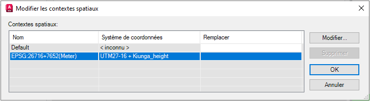 - Cliquez sur Modifier les systèmes de coordonnées et, dans la boîte de dialogue Modifier les contextes spatiaux, cliquez sur l’entrée.