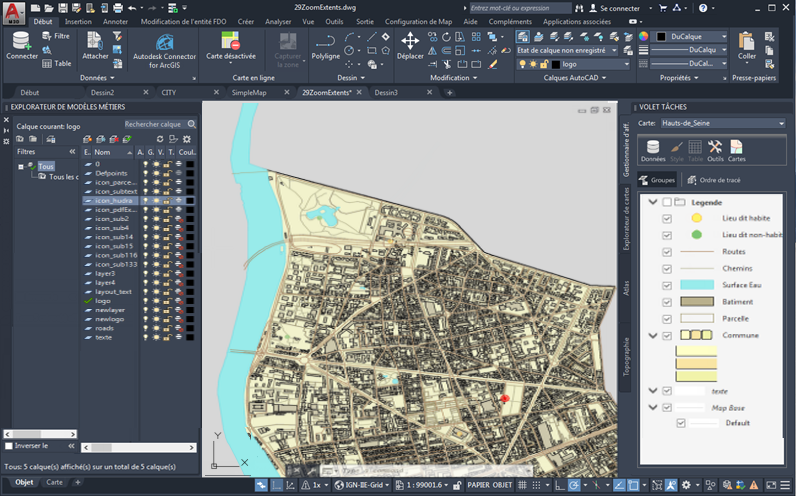 Elle contient des calques AutoCAD (à gauche) et les calques du gestionnaire d'affichage (à droite).