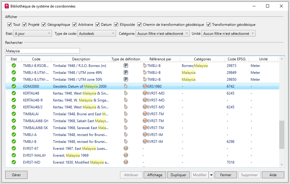 AutoCAD Map 3D 2026 inclut les mises à jour suivantes liées au système de coordonnées :