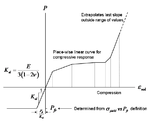 The pressure versus volumetric strain behavior can be defined using a piecewise linear curve where volumetric plasticity and volumetric bulking can be specified in the compression regime. The volumetric tensile behavior is elastic and defines a volumetric fracture pressure that defines a “no tension” material when the volumetric strain exceeds the Pfr value determined from the input parameters.