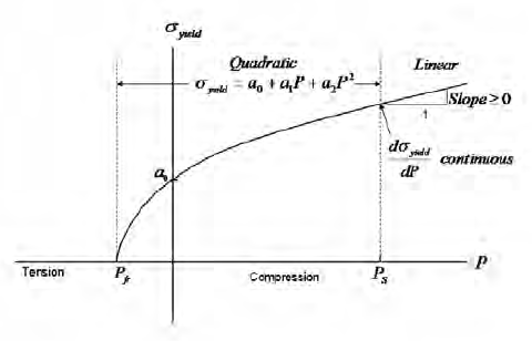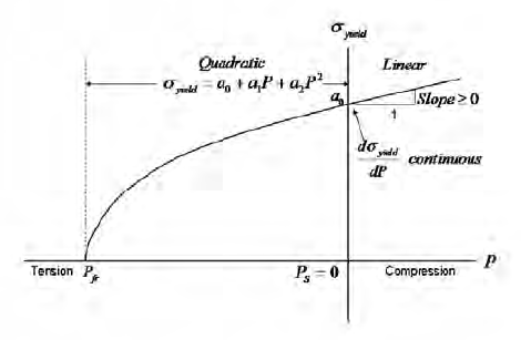 The deviatoric plasticity is pressure dependent and may be defined with a linear dependence on pressure or a quadratic dependence on pressure. When a linear dependence is used this model is similar to a classical Drucker-Prager material model.