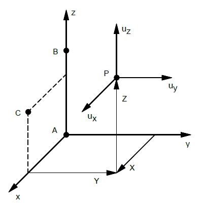 - The displacement coordinate directions at P are dependent on the location of P as shown above by (uX, uY, uz).