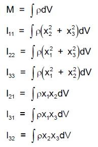 The x1, x2, x3 are components of distance from the center of gravity in the coordinate system defined in field 4. Only the magnitude of Iij should be supplied; the negative signs for the off-diagonal terms are supplied automatically. The inertia terms are transformed to the principal coordinate system for the inertia tensor for the rigid body.
