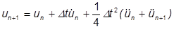 The beta value in the above equation is called the Newmark-Beta, and can vary between 0 and 1. It is usually used as ¼, which yields the constant average acceleration method, where: