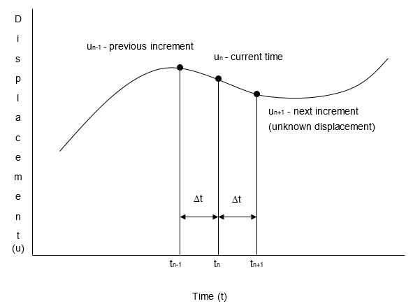 The fundamental structural response (displacement) is solved at discrete times, typically at a series of time steps with a constant time increment between them. The solution strategy is called the central finite difference method and is based on finding the displacement, velocity and acceleration at subsequent times, knowing those values at the current and past times. The image below shows a transient integration graph.