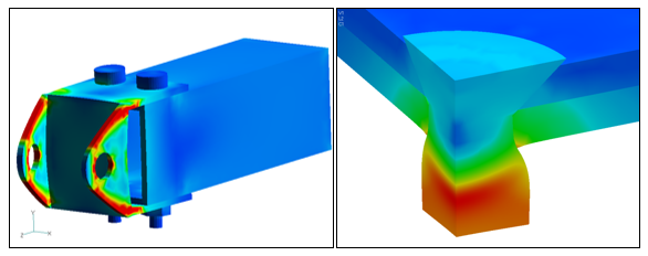The metal bracket from the image below shows the very different stress distribution between linear and nonlinear materials. The metal has a yield stress of 50ksi. The left image contains the results of a linear material analysis and show peak stresses well above yield. The nonlinear material analysis on the right shows a much different contour due to the stress redistribution. Peak plastic strain was 1% in the nonlinear material analysis.