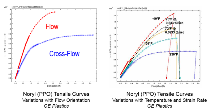 These curves below for Noryl, a GE Plastics PPO, were measured using ASTM D638, the standard tensile test for plastics. The curve on the left shows how the stress-strain relationship in plastics can vary with injection molding flow direction. The curves on the right show how the same material can have differing stress-strain responses at different strain, or loading, rates and temperatures.