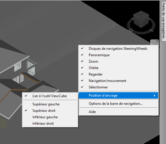 La barre de navigation permet d'accéder aux outils liés à la navigation interactive et à l'orientation dans le modèle, notamment l'outil Autodesk® ViewCube®, les disques de navigation SteeringWheels® et la souris 3D 3Dconnexion®.