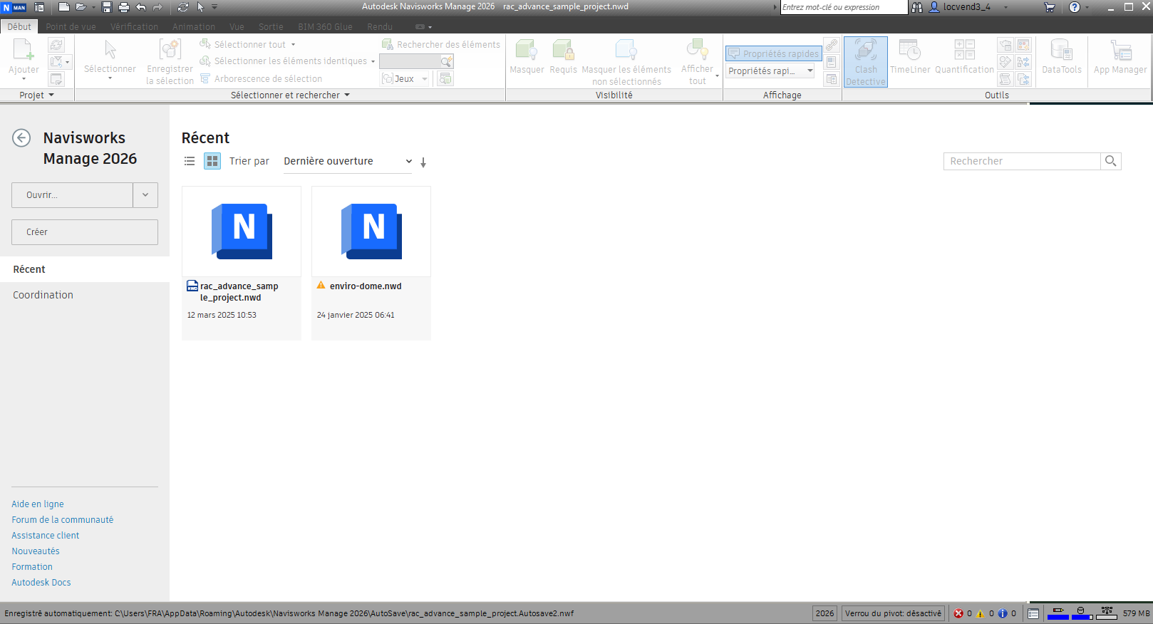 Utilisez la page Début de Navisworks pour accéder aux informations relatives à vos modèles et les gérer.