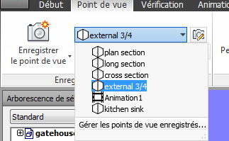 Cliquez sur l'onglet Point de vue > groupe de fonctions Enregistrer, charger et lire > liste déroulante Points de vue enregistrés, puis sélectionnez le point de vue à réviser.