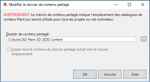 Remarque : Le dossier de contenu partagé s'applique à l'installation du logiciel AutoCAD Plant 3D toolset.