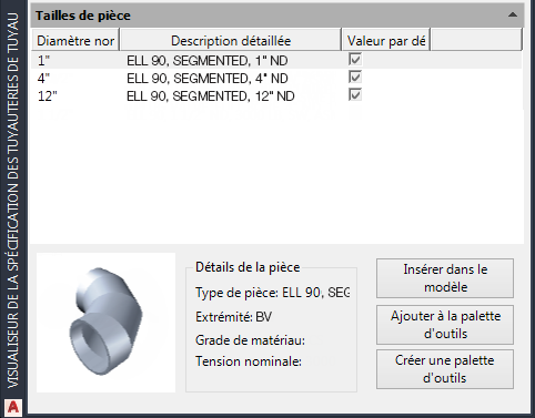 Vous pouvez créer un composant, spécifier la classe et la géométrie des tuyauteries, définir des plages de tailles et l’ajouter à un catalogue.