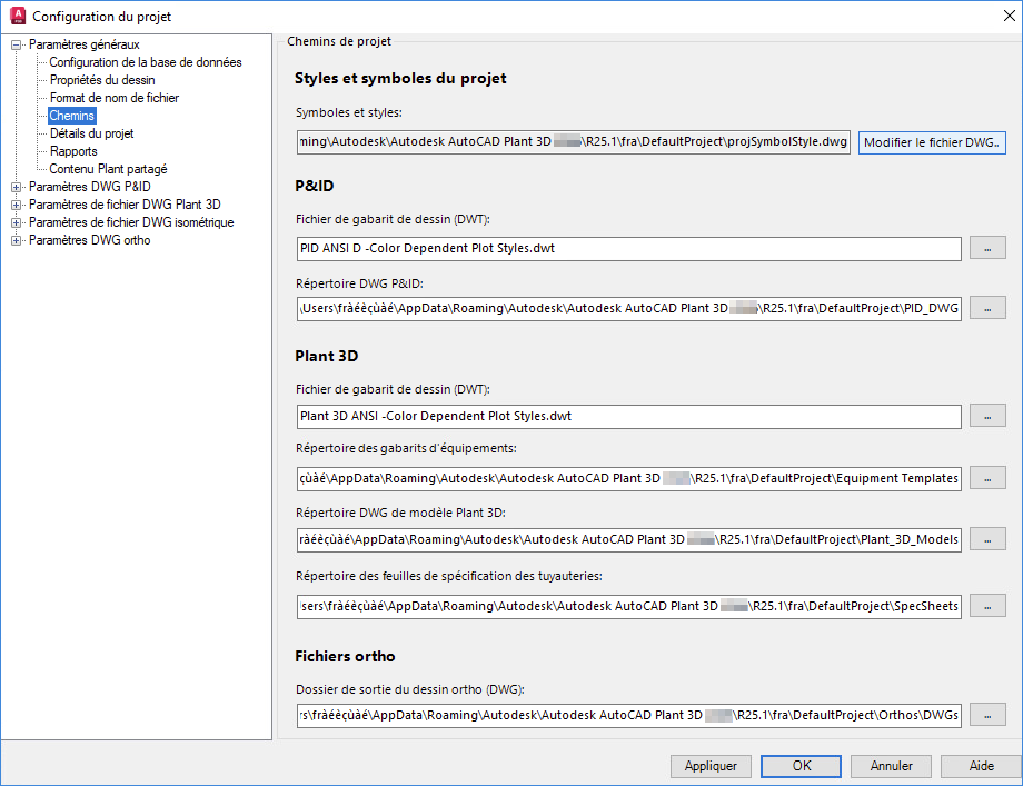 Définition de nouveaux chemins de projet (Plant 3D)