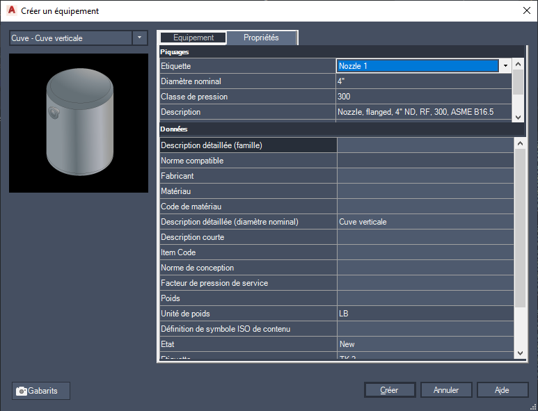 Répertorie les données que vous pouvez ajouter ou modifier pour le type d'équipement sélectionné dans l'onglet Equipement.