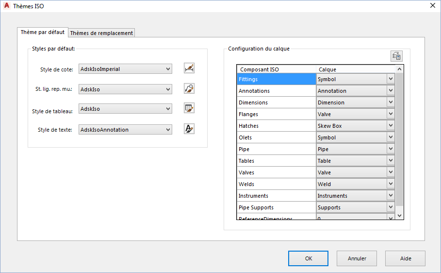 Dans la boîte de dialogue Thèmes Iso, onglet Défaut, effectuez les opérations suivantes :