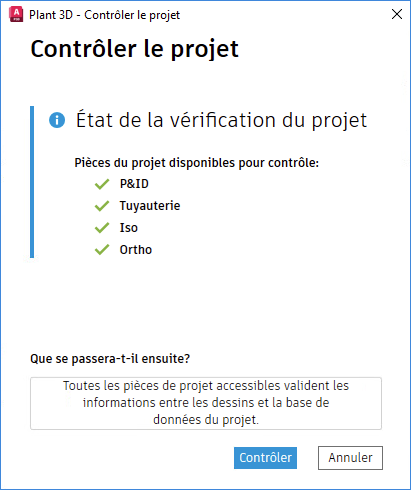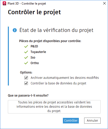 Le contrôle d’un projet permet aux gestionnaires ou aux administrateurs de projet d’évaluer et de corriger les erreurs afin de garantir l’intégrité du projet. Le processus de contrôle recherche les erreurs, telles que les liens entre des propriétés inexistantes, les incohérences dans le registre d’étiquette ou les enregistrements orphelins qui ne pointent plus vers un objet dans un dessin source.