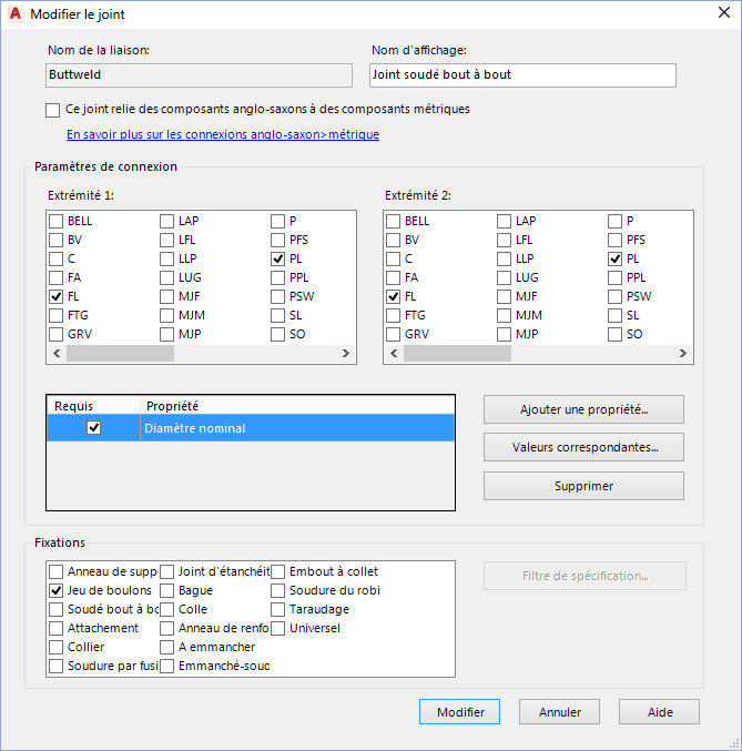 Les types de liaison prenant en charge les connexions en unités anglo-saxonnes/métriques se distinguent des types de liaison utilisant les mêmes unités. Cela vous permet de définir des propriétés correspondantes telles que 150#, 10PN.