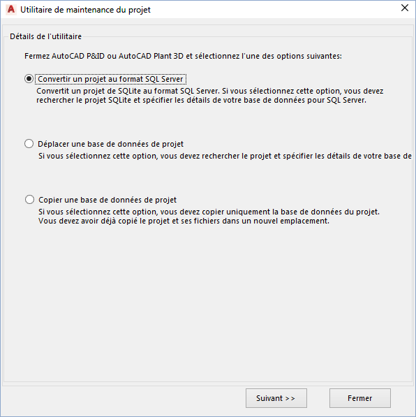 Cliquez sur Suivant pour afficher la boîte de dialogue Utilitaire de maintenance du projet - Convertir un projet vers SQL Express.