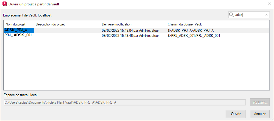 Remarque : Pour prendre en charge plusieurs connexions au coffre-fort sur un même ordinateur, cliquez sur Modifier pour définir le dossier d'espace de travail local. Par exemple, vous pouvez configurer .\Documents\Plant Vault Projects_Admin\NomProjet pour la connexion administrateur et utiliser le dossier par défaut pour une autre connexion au coffre-fort. L'option Modifier est activée à la première ouverture d'un projet (pour chaque connexion au coffre-fort).