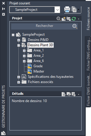 Le Gestionnaire de projets contient trois onglets : Fichiers source, Fichier DWG orthographique et Fichier DWG isométrique.