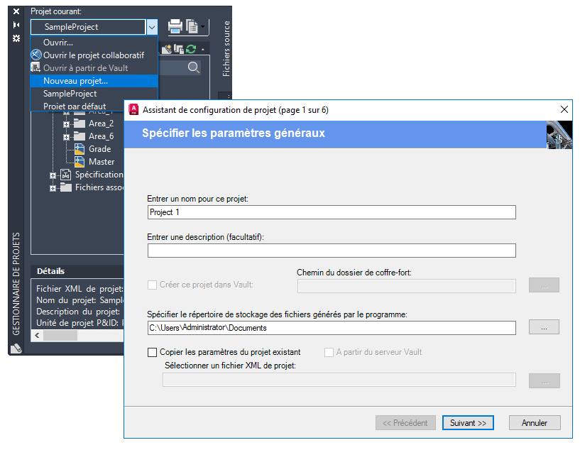 Le projet par défaut et tous les projets que vous créez contiennent des paramètres par défaut concernant les chemins, les dessins, la configuration du Gestionnaire de données, etc. Ces paramètres par défaut conviennent souvent pour la plupart des tâches d'un projet. Toutefois, vous pouvez les configurer en fonction des besoins spécifiques de votre entreprise ou de votre client. Vous pouvez configurer votre environnement de dessin dans la boîte de dialogue Configuration de projet.