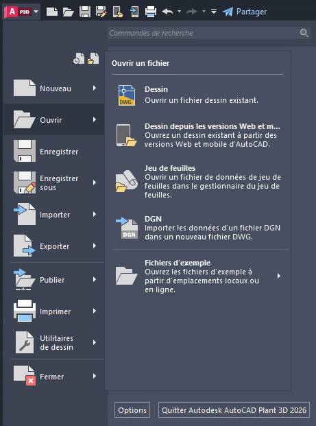 Le menu de l’application, situé dans le coin supérieur gauche du programme, remplace la structure de menu classique des versions précédentes du jeu d’outils AutoCAD Plant 3D toolset.