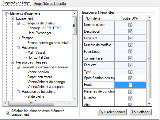 - Dans l'arborescence, cliquez sur un composant (p. ex. Equipement). Dans la colonne Sortie DWF du volet Propriétés, désactivez la case à cocher des propriétés que vous ne souhaitez pas publier (p. ex. Poids).