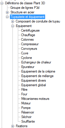 - Continuez à développer la liste jusqu'à localiser une définition de classe d'objet Plant 3D (p. ex. Tuyauterie et équipement