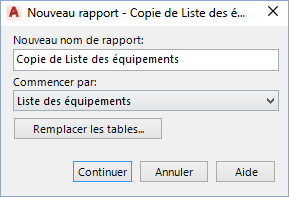 4. Dans la boîte de dialogue Nouveau rapport, entrez le nom du nouveau rapport (p. ex. Nouvelle luste d'équipements).