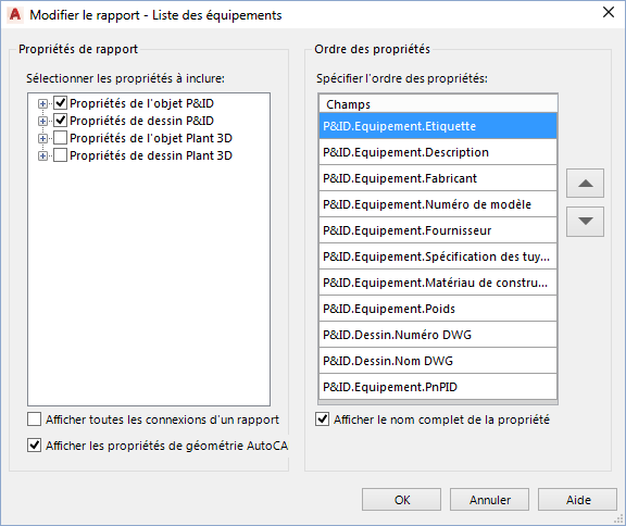 Si vous créez un gabarit de rapport Plant 3D, vous pouvez spécifier des propriétés d'objet ou de dessin Plant 3D ou les trier de la façon appropriée. Les données Plant 3D ne sont incluses dans le rapport que si un objet P&ID correspondant avec la même étiquette existe dans le projet.