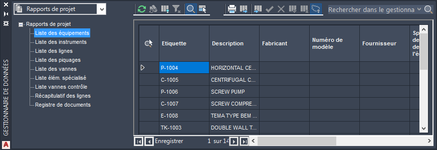 L'arborescence du Gestionnaire de données affiche les types de rapport et les rapports définis pour un projet en cours. La vue de données affiche les champs du rapport.