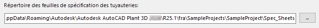 Dans la zone « Répertoire des feuilles de spécification des tuyauteries » de la section Chemins, entrez le chemin d’accès de l’emplacement de vos fichiers de spécification des tuyauteries ou cliquez sur le bouton [...] pour rechercher et sélectionner cet emplacement.