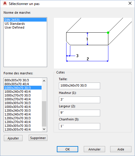 Spécifie la norme de marche, la forme des marches et les cotes de l'escalier.