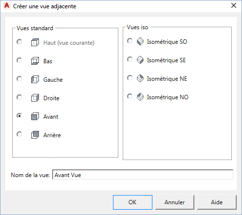 Indique la vue orthographique haut, bas, gauche, droite, avant ou arrière de la vue adjacente.
