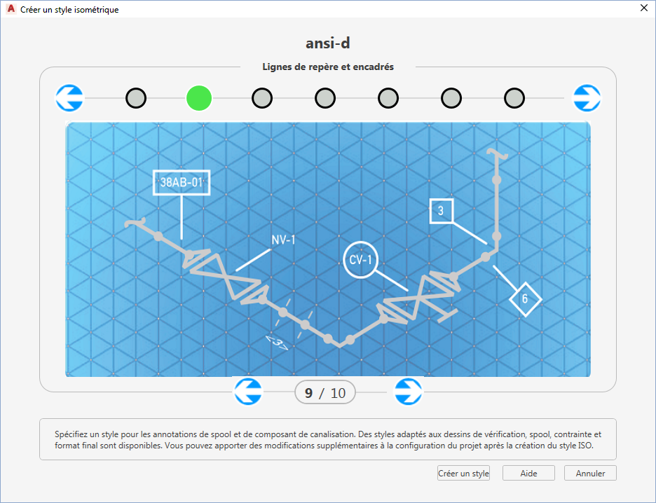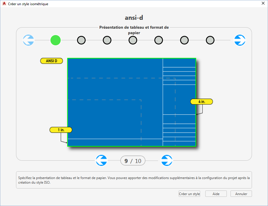 Dans la partie inférieure, cliquez sur les flèches de gauche et de droite pour sélectionner la présentation des tableaux et la taille de la feuille. Par exemple, ANSI D avec une zone de nomenclature de 4 pouces sur la gauche.